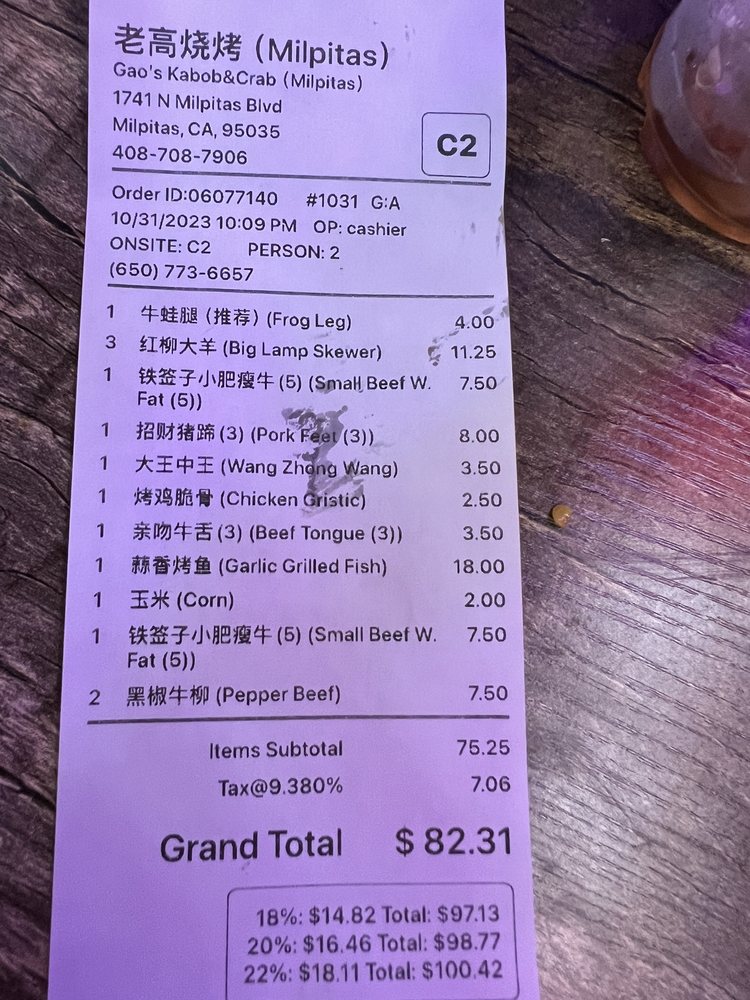 GAO’s Kabob & Crab is a trendy beer bar offering a unique blend of Chinese-style kabobs and seafood. Located in Milpitas, CA, it caters to a diverse crowd with its hipster vibe and casual atmosphere. The menu features an array of kabobs including beef, lamb, chicken gizzard, intestines, squid tentacles, and more. Customers rave about the intense BBQ flavors, generous portion sizes, and authentic Chinese BBQ experience. Standout dishes include the snow crab plate with shrimps, potato, and sausage, as well as the soy sauce fried rice and jellyfish salad. While the service can be hit or miss, the overall dining experience is satisfying. With gender-neutral restrooms, free Wi-Fi, and compostable containers, GAO’s Kabob & Crab offers a unique and flavorful dining option for those looking to enjoy a night out with friends or a late-night meal.
